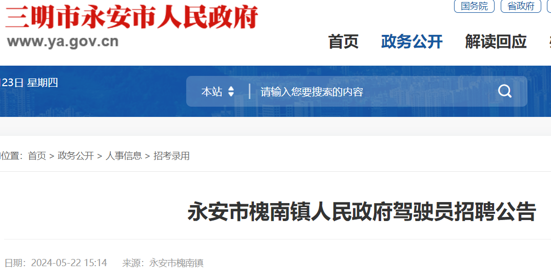 因工作需要,永安市槐南鎮(zhèn)人民政府決定面向社會(huì)公開招聘駕駛員1名,現(xiàn)將有關(guān)情況公告如下: