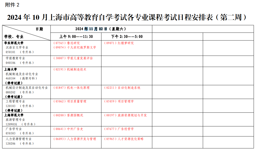 2.2024年10月上海市高等教育自學(xué)考試各專(zhuān)業(yè)課程考試日程安排表(第二周)