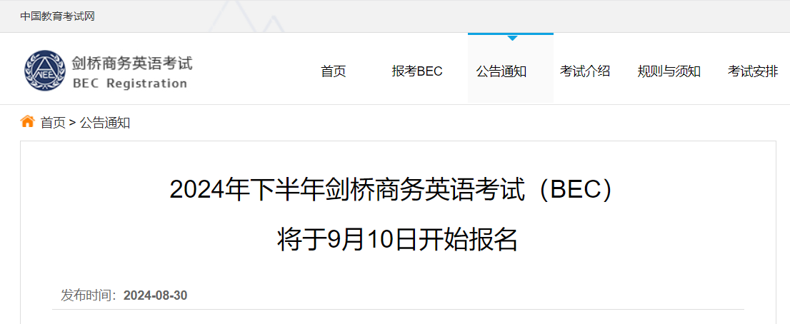 從中國教育考試網(wǎng)發(fā)布的《2024年下半年劍橋商務(wù)英語考試(BEC)將于9月10日開始報名》得知,2024下半年天津商務(wù)英語報名時間、報考條件及流程已公布,9月10日10:00至9月19日10:00進行報名,具體詳情如下: