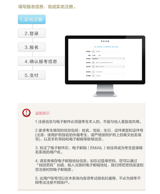 考生報名時須如實、準確提交身份證件信息,包括:證件類型、證件號碼、中文姓名、拼音姓名、性別和出生日期,確認提交后,不得更改,并將打印在準考證上;考生在考試日須攜帶與準考證信息一致的有效身份證件原件。