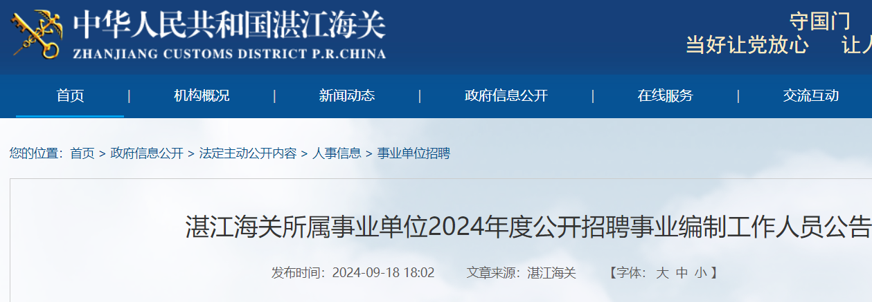 小編根據(jù)中華人民共和國湛江海關發(fā)布”湛江海關所屬事業(yè)單位2024年度公開招聘事業(yè)編制工作人員公告“得知,2024廣東湛江海關所屬事業(yè)單位招聘事業(yè)編制工作人員15人,報名時間為9月23日至9月29日。