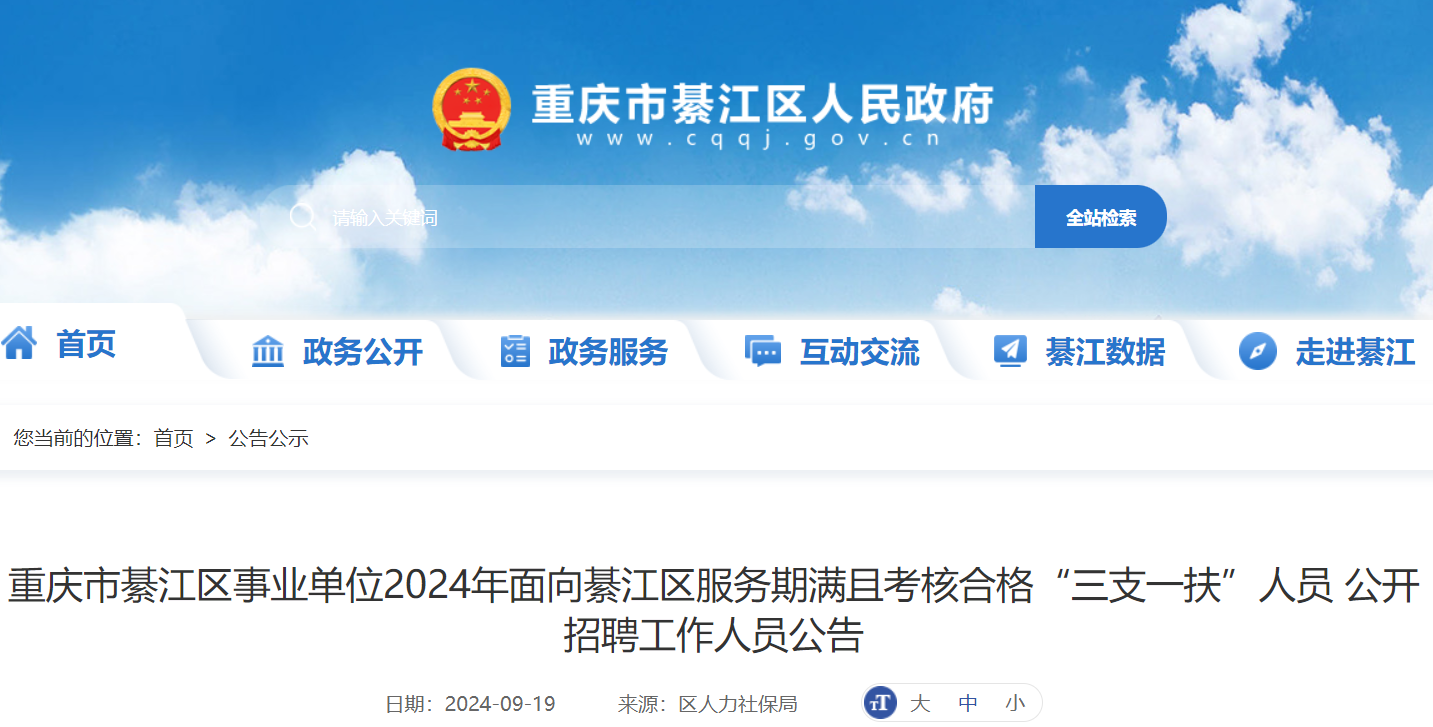 小編根據(jù)重慶市綦江區(qū)人民政府發(fā)布”重慶市綦江區(qū)事業(yè)單位2024年面向綦江區(qū)服務(wù)期滿且考核合格“三支一扶”人員 公開(kāi)招聘工作人員公告“得知,2024重慶綦江事業(yè)單位面向三支一扶期滿合格人員招聘33人,報(bào)名時(shí)間為2024年9月25日。