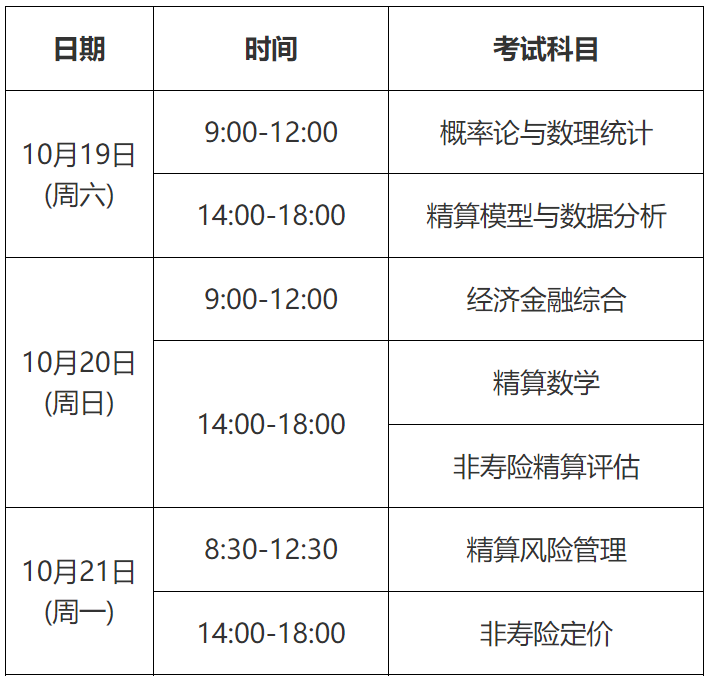 小編根據(jù)中國精算師協(xié)會(huì)發(fā)布”2024年下半年精算師職業(yè)資格考試日程安排公告“得知,西藏2024年下半年精算師考試時(shí)間為10月19日-10月23日,考試科目如下: