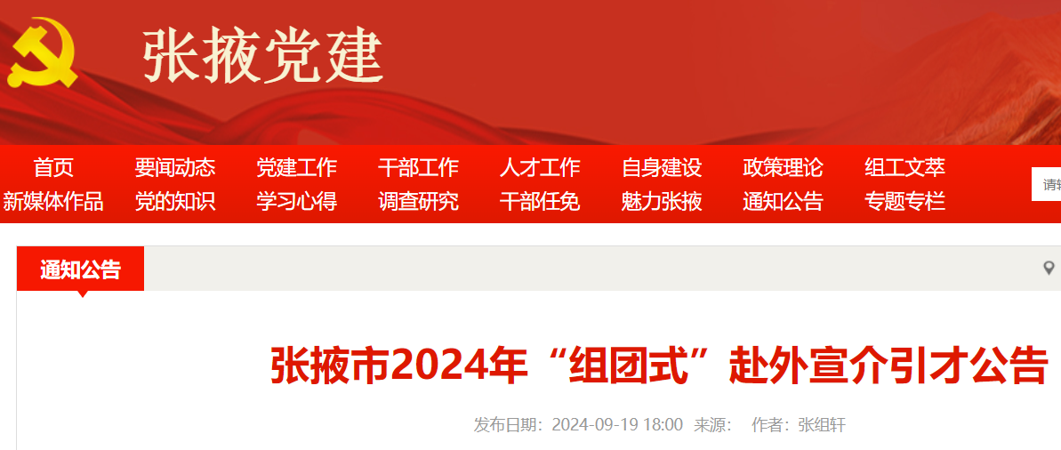 小編根據(jù)張掖市人力資源和社會保障局發(fā)布”張掖市2024年“組團式”赴外宣介引才公告“得知,2024年甘肅省張掖市“組團式”赴外宣介引才92人,報名時間為9月23日至10月12日。