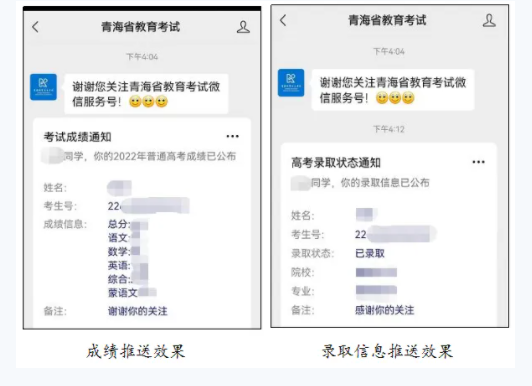 從青海省教育考試網(wǎng)發(fā)布的《2024年青海普通高考考生綁定“青海省教育考試”微信服務(wù)號(hào)工作的通知》得知,2024年綁定青海省教育考試微信服務(wù)號(hào)可接收高考成績(jī)及錄取信息,具體詳情: