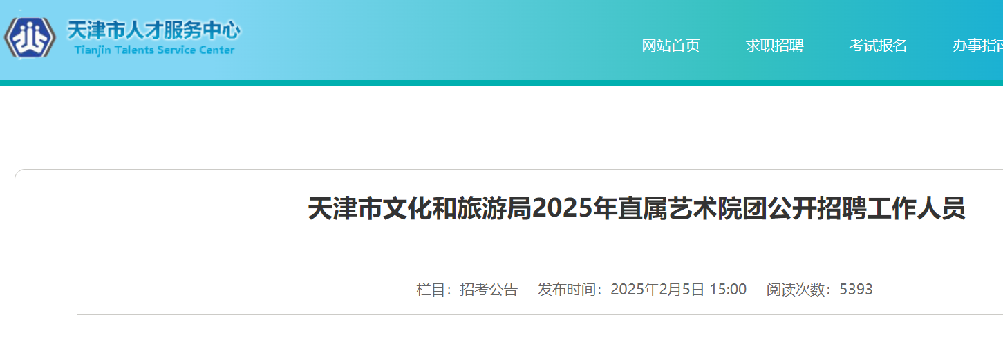 2025年2月5日在天津市文化和旅游局門戶網(wǎng)站、北方人才網(wǎng)、天津市人才服務(wù)中心網(wǎng)站、各招考單位發(fā)布招聘信息,考生可通過上述網(wǎng)站查詢相關(guān)信息,發(fā)布時(shí)間不少于7個(gè)工作日。