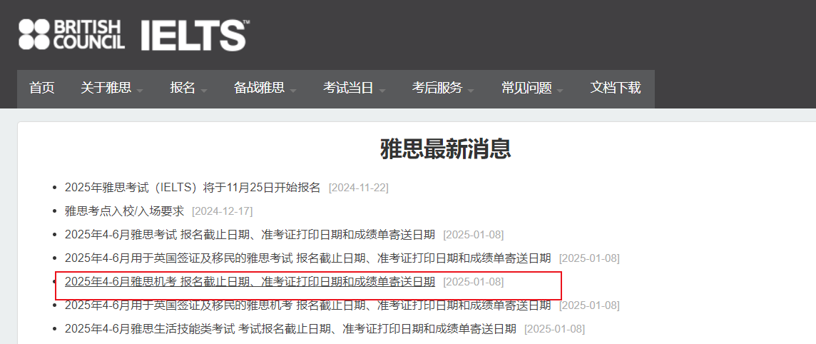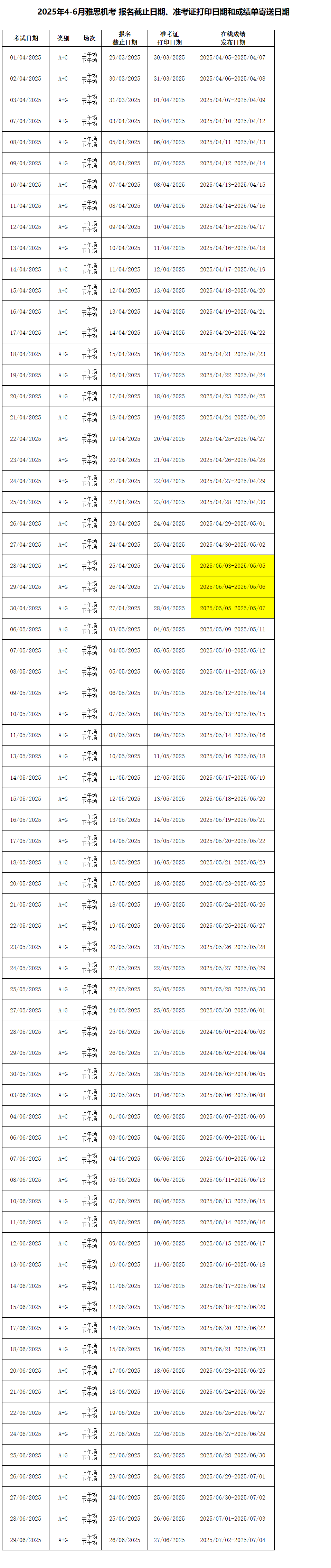 從教育部教育考試院獲悉,2025年4-6月雅思機(jī)考報(bào)名截止日期、準(zhǔn)考證打印日期和成績(jī)單寄送日期已公布,具體詳情如下: