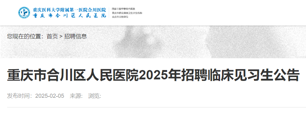2025年重慶市合川區(qū)人民醫(yī)院招聘臨床見習(xí)生公告已發(fā)布,報(bào)名時(shí)間:即日起至報(bào)滿為止?,F(xiàn)將招聘公告原文發(fā)布如下: