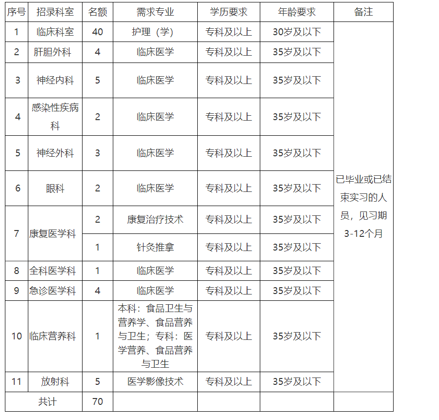 因工作需要,我院擬招聘見習(xí)生多名到各臨床醫(yī)技科室見習(xí),現(xiàn)將相關(guān)事項(xiàng)公告如下:一、提供的見習(xí)崗位及擬招聘人數(shù):