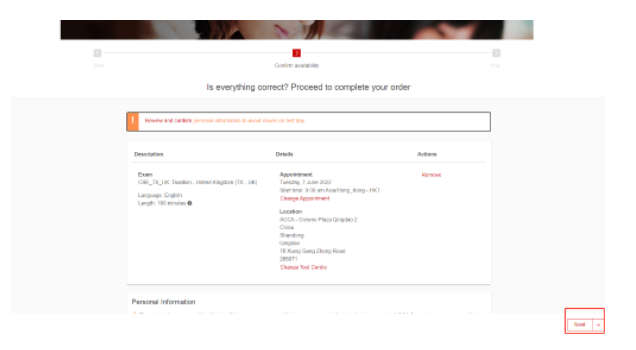 確定所預(yù)約考試的信息,點擊頁面底部“Next。