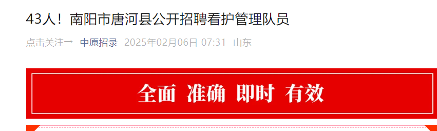 小編根據(jù)中原招錄發(fā)布“南陽(yáng)市唐河縣公開(kāi)招聘看護(hù)管理隊(duì)員”得知,2025年河南南陽(yáng)市唐河縣招聘看護(hù)管理隊(duì)員43人,報(bào)名時(shí)間為2025年1月23日至2025年2月8日。