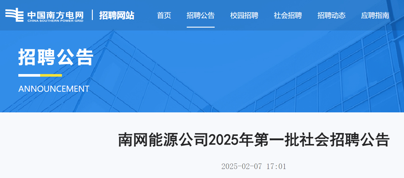 2025年南網(wǎng)能源公司第一批社會招聘公告已發(fā)布,報名時間:即日起至2025年2月14日17:00?,F(xiàn)將招聘公告原文發(fā)布如下: