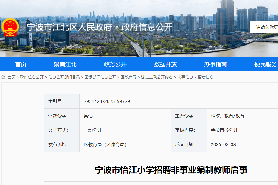 2025年浙江寧波市怡江小學(xué)招聘非事業(yè)編制教師啟事已發(fā)布,應(yīng)聘材料投遞截止時間:招到合適人員就停止招聘。現(xiàn)將招聘公告原文發(fā)布如下: