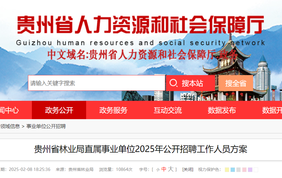 貴州人力資源和社會保障網(wǎng)(http://rst.guizhou.gov.cn)、貴州省林業(yè)局網(wǎng)站(http://lyj.guizhou.gov.cn)發(fā)布公開招聘公告。公告時間從2025年2月8日到2025年 2月17日。