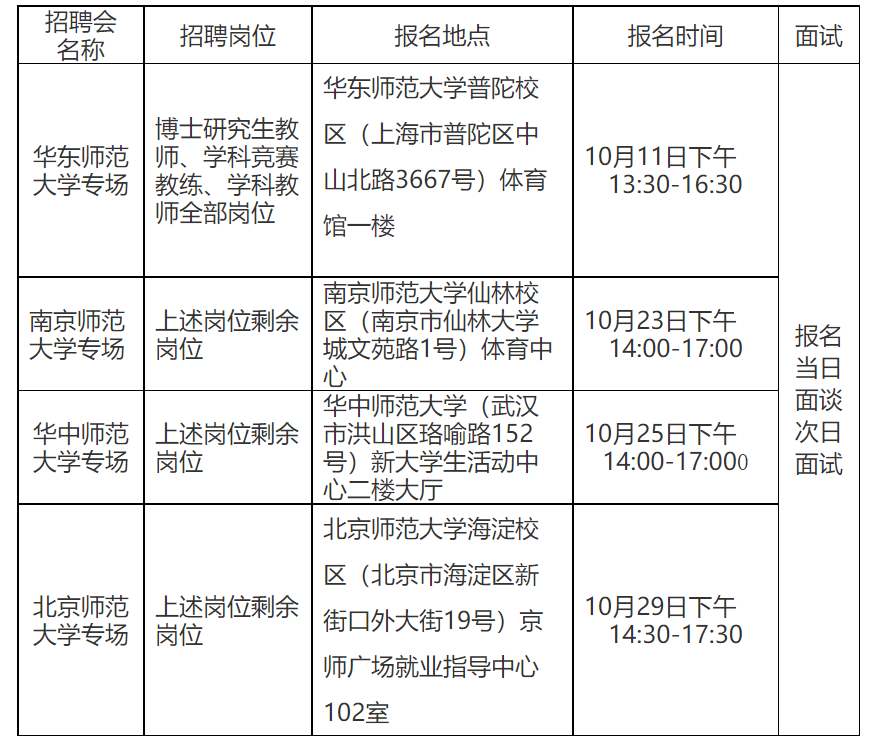 諸暨中學2025年事業(yè)編制教師招聘會專場地點分別設在華東師范大學、南京師范大學、華中師范大學、北京師范大學,每個專場招聘結束后,將通過諸暨市政府門戶網站公告欄發(fā)布招聘剩余崗位,并據此推出后續(xù)招聘專場。