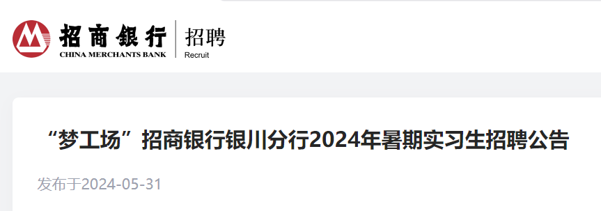 2024年招商銀行寧夏銀川分行暑期實(shí)習(xí)生招聘公告已發(fā)布,簡歷投遞截止時(shí)間:2024年6月21日。現(xiàn)將招聘公告原文發(fā)布如下: