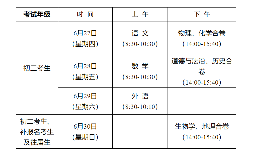 (一)初中畢業(yè)生學業(yè)考試筆試時間為:2024年6月27日-29日;初二年級生物學、地理學業(yè)水平考試時間為:2024年6月30日。