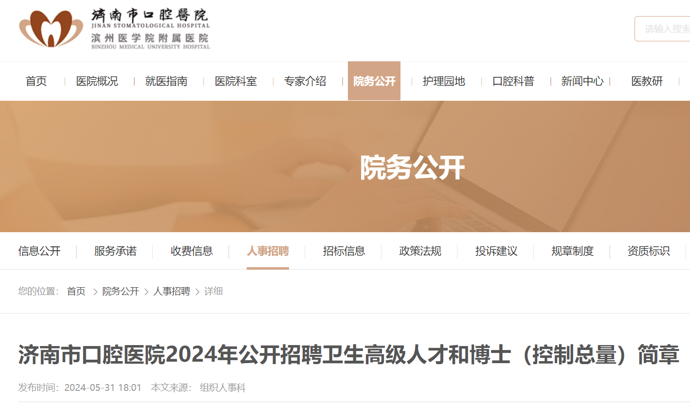 2024年山東濟南市口腔醫(yī)院公開招聘衛(wèi)生高級人才和博士(控制總量)簡章已發(fā)布,自簡章發(fā)布之日起開始報名,根據(jù)崗位報名情況,適時啟動考試、考察、體檢程序,崗位招滿即止,未招滿的崗位報名有效期至2024年11月30日?,F(xiàn)將招聘公告原文發(fā)布如下: